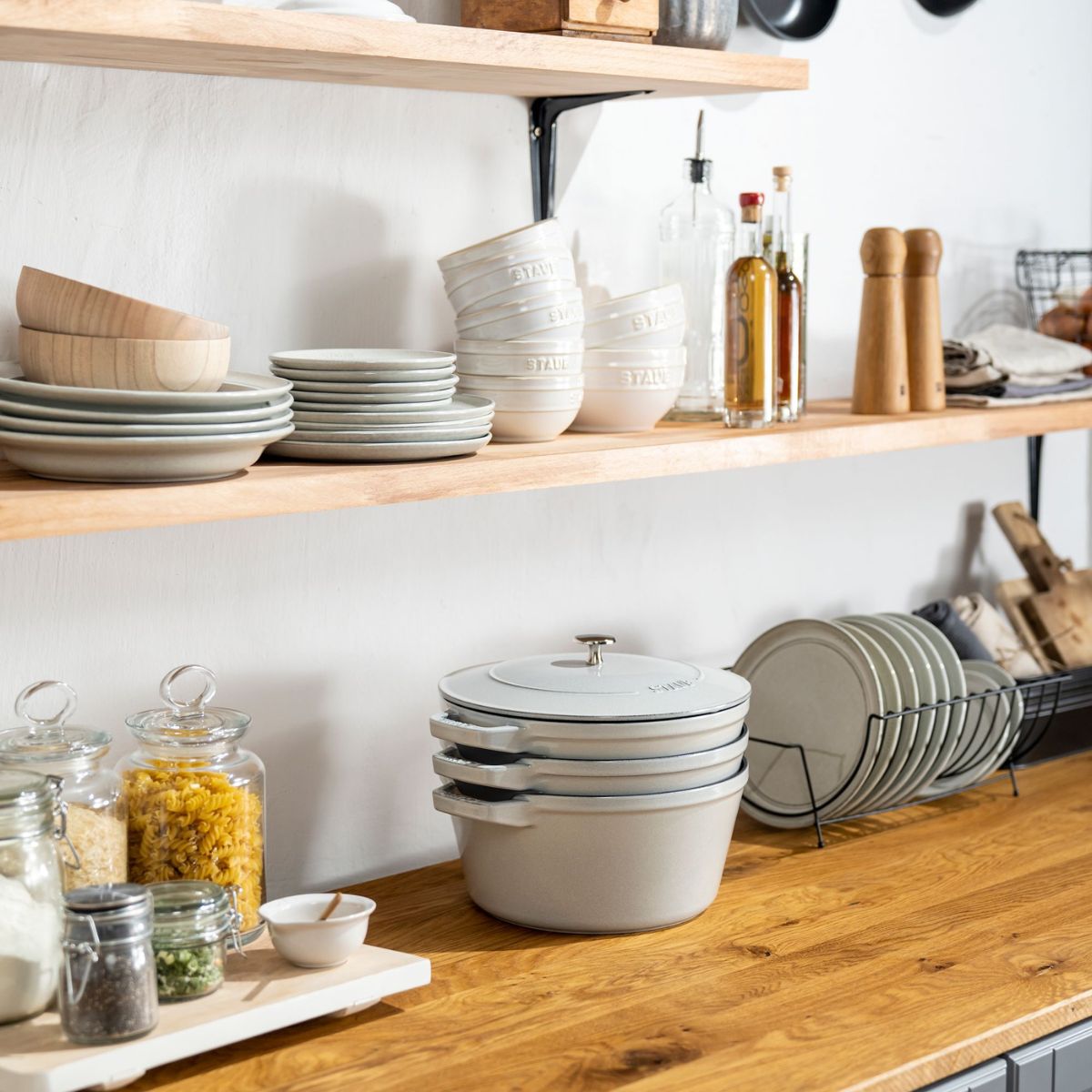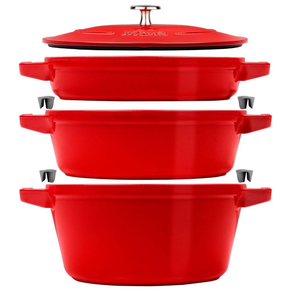 The clever designers at Staub have combined some of their favourite pieces in this ingenious stackable set. Starting with the original cocotte they have added a smooth-surface fry pan and a deep braiser plus a 24cm universal lid. This is a true heritage collection to use for a lifetime and then pass onto the next generation of cooks.