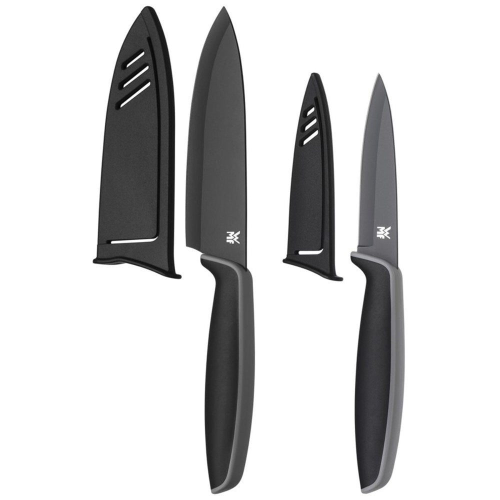 Add a touch of colour to your culinary collection: This Touch Kitchen Knife Set by WMF offers perfect everyday cutting performance designed to meet all your chopping, slicing and dicing needs—all with sleek modern style and allure. The Touch Collection offers durability and results at WMF standards of quality, hardened blades ensure lasting sharpness, expertly crafted from special coated blade steel that stands the test of time. Easy-grip non-slip handles offer enhanced ergonomics for smooth and comfortable handling, while protective blade sleeves promise safe storage with total peace of mind. A highly aesthetic colourful design is the perfect finishing touch, complete with modern contours and eye-catching style.
