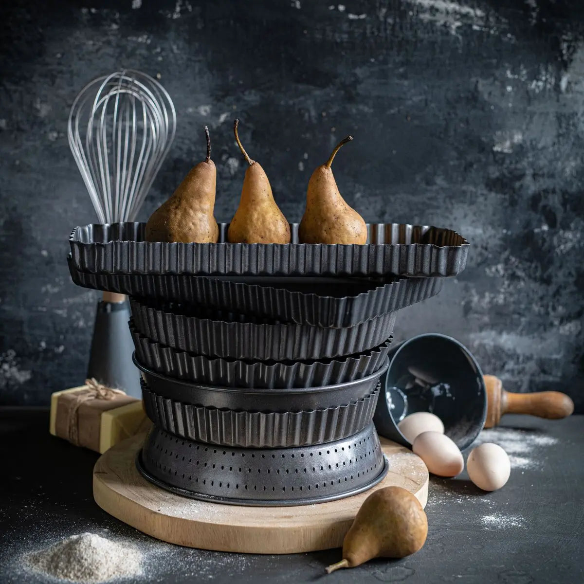 A heavy duty fluted round tin ideal for making quiches, tarts and flans. Features a double non-stick coating and loose base for easy release.