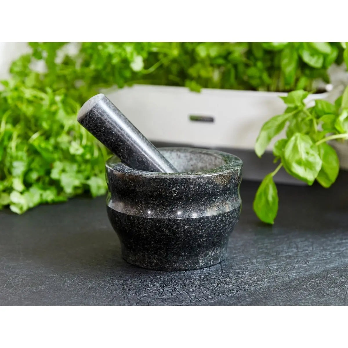 This high quality pestle & mortar is designed to maximize surface contact between the two elements. Inner surface is designed for use on dry and wet mixes; long easy grip handle for ease of use. The superior black granite adds style and durability with an easy clean, smooth exterior and ridged base for an optimized grip on your workspace. Use to create and serve many dishes, such as guacamole, hummus and salsa as well as preparing dry rubs and marinades.