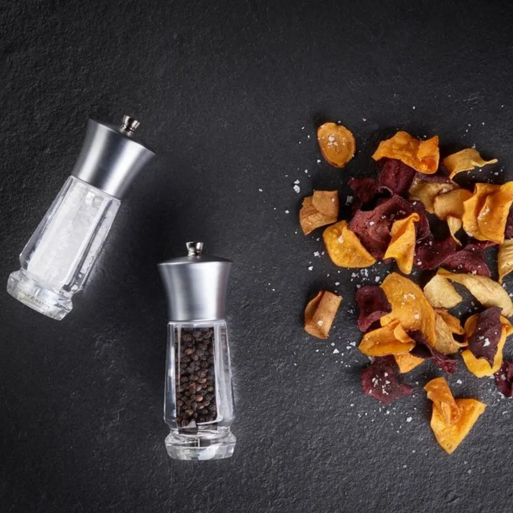 The Exford Mills have a multi-faceted clear acrylic body with a satin finish ‘Nickel’ stainless steel top.
