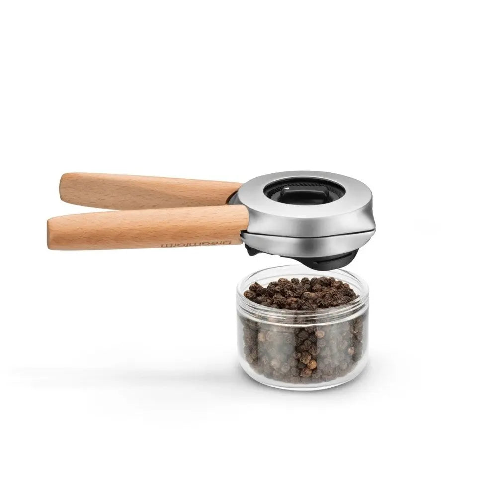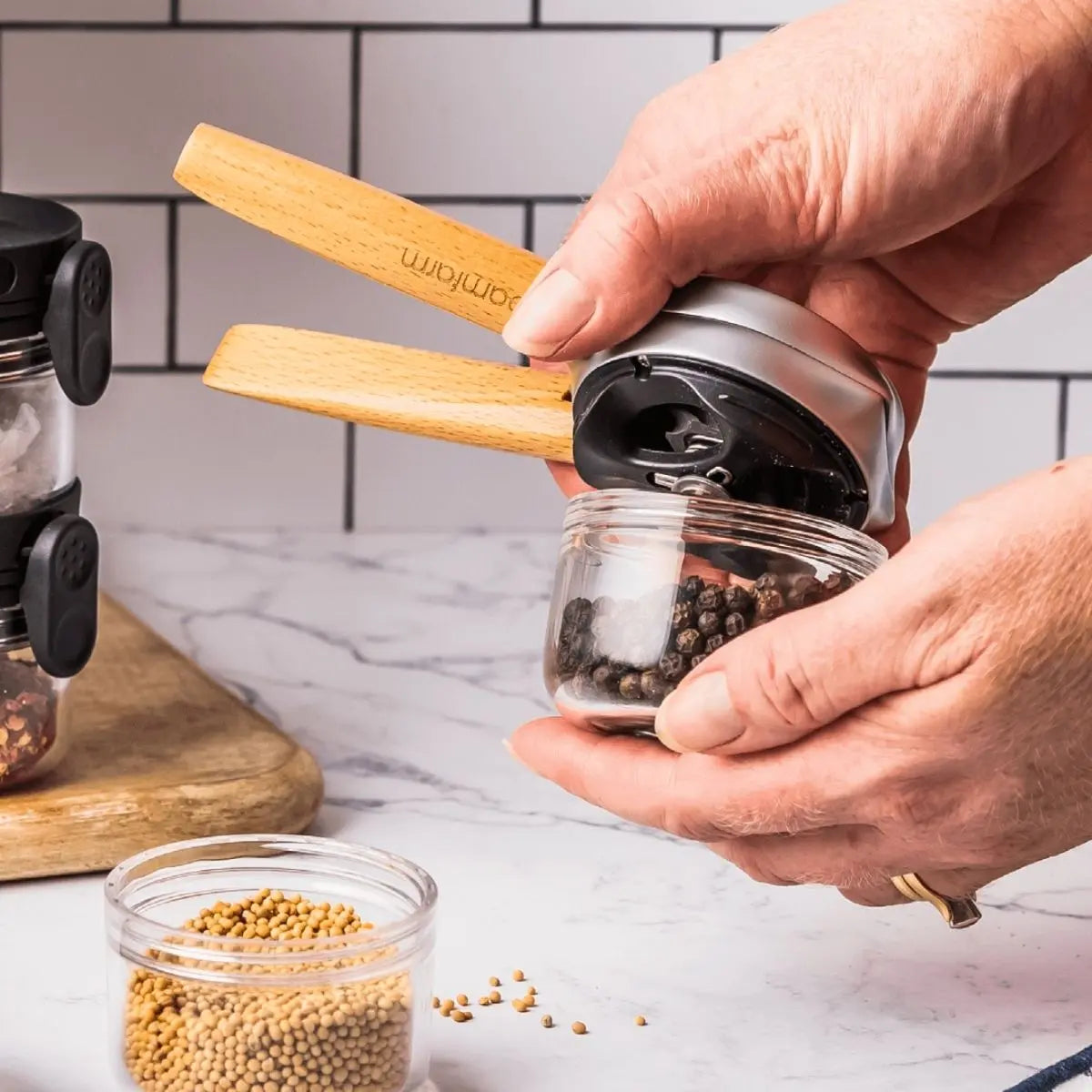 Replacement Ortwo clear glass spice jar, which makes it easy to see how much is left, has been tempered for strength, and sits flat for easy refilling into its wide-mouth opening.
