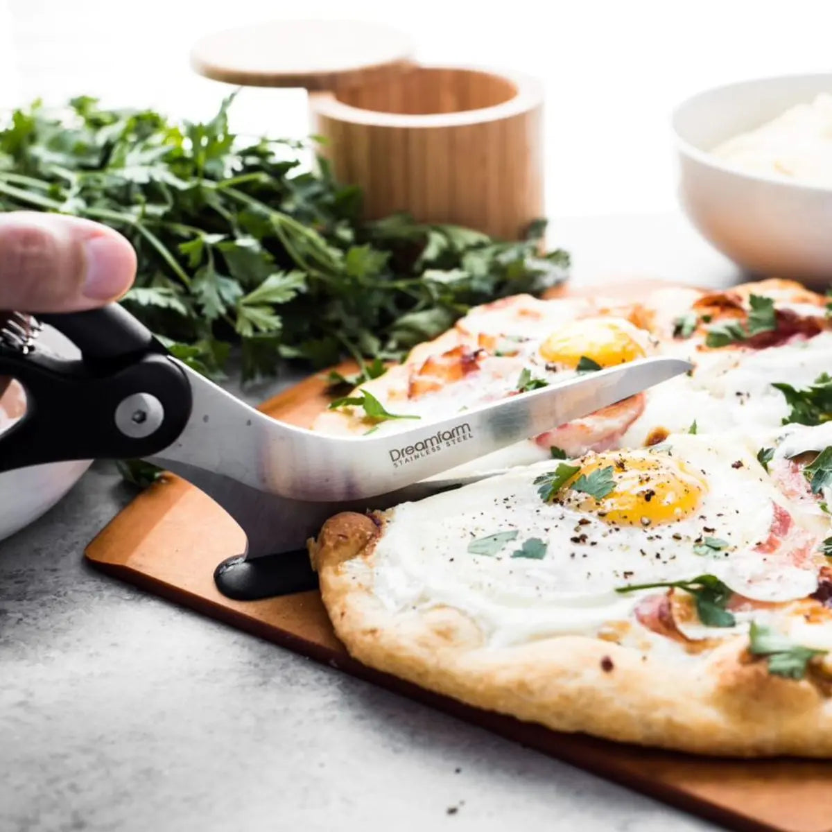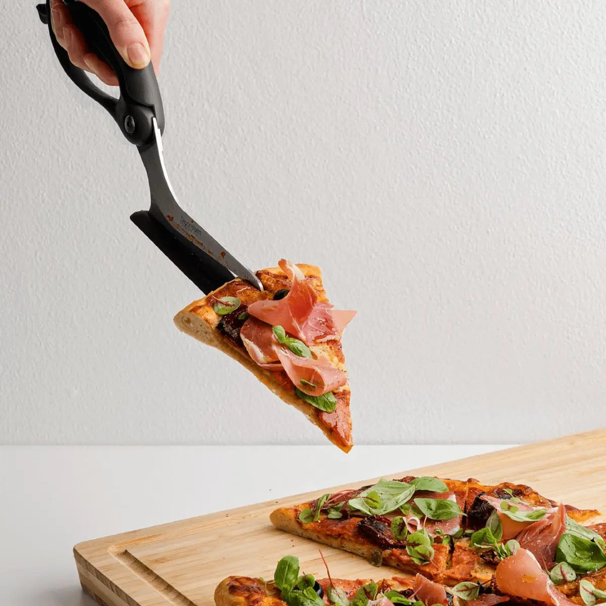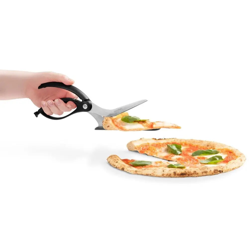 Scizza’s clever curved blades slice from above to keep your toppings in place and your hands away from your hot food. The unique spatula shoe slides under your pizza, protects your non-stick pans and is heat resistant to 205°C. Hardened German stainless steel blades provide a sharp, long lasting, and dishwasher safe cutting edge. Extra long 15cm blades cleanly and completely cut right across all types of pizza and flat breads.