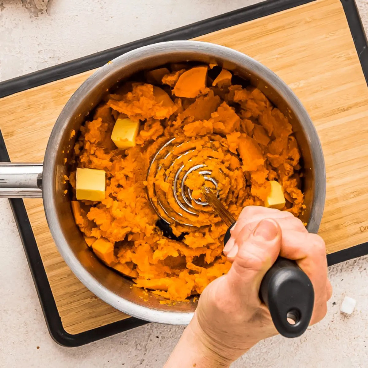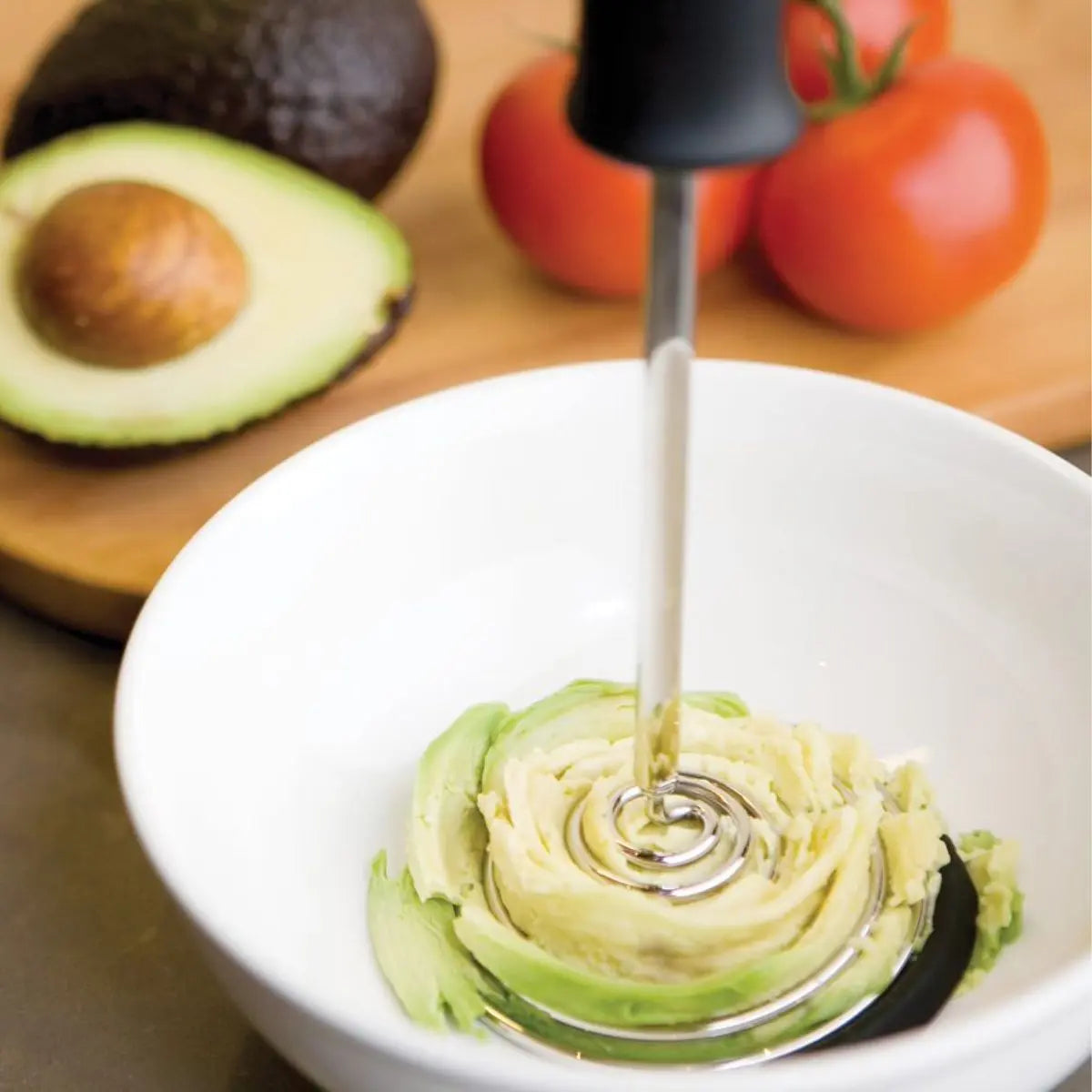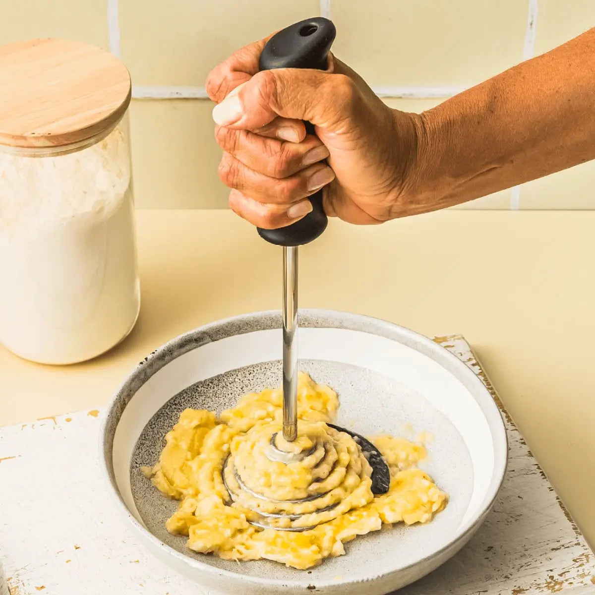 The Smood effortlessly creates smooth mash in seconds by trapping food and forcing it through the thin gaps between the collapsing stainless steel spring coils. The unique spring design eliminates jarring on the wrist by absorbing the downward force. The multi-grip handle is ergonomically designed to be held in several comfortable hand positions for maximum efficiency. The silicone scraper makes it easy to clean the pot or bowl and is heat resistant to 260°C / 500°F.