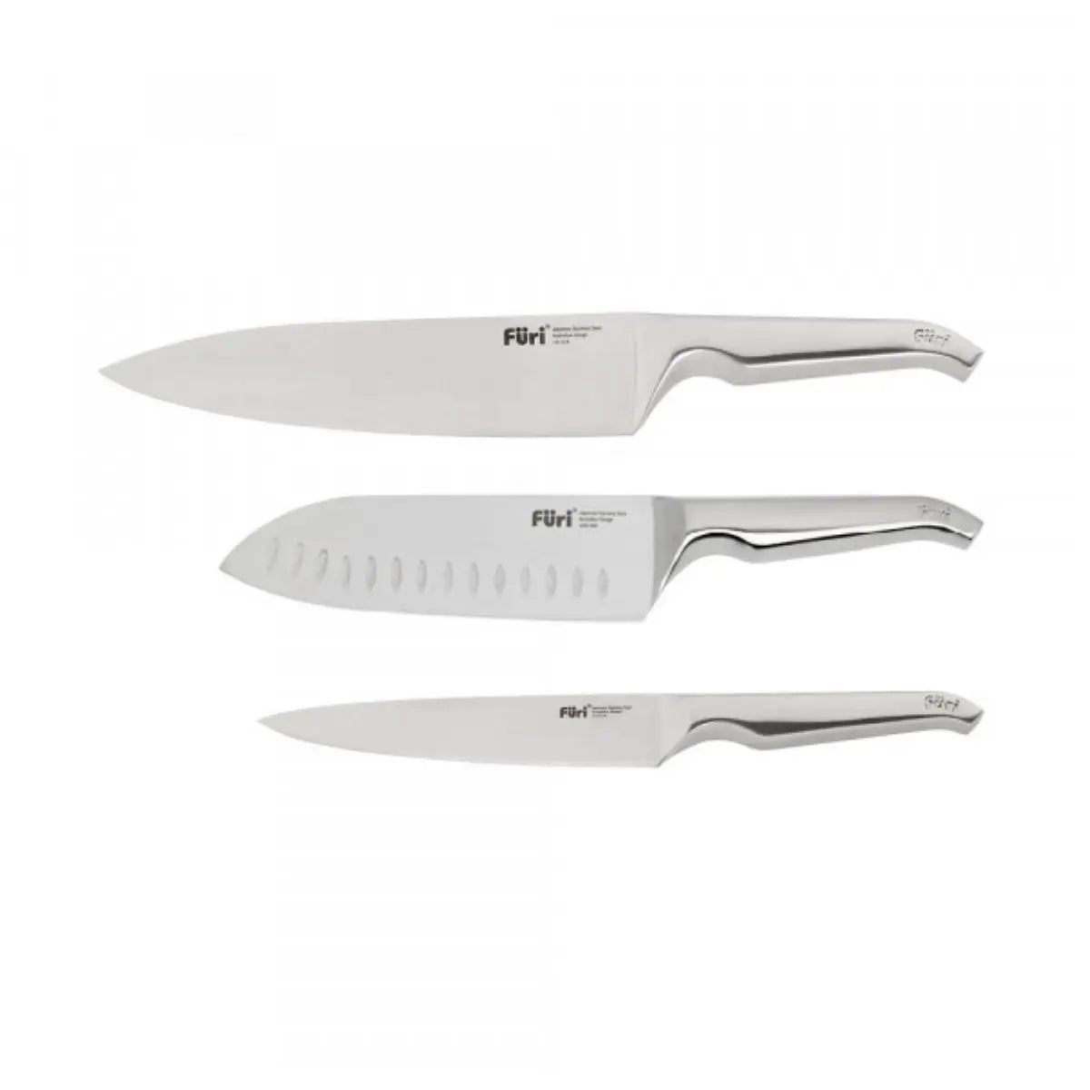Furi Pro knives offer superior knife cutting performance for both the professional chef and home cooking enthusiast. Engineered with the innovative Furi reverse-wedge handle. The handle locks into the hand for a more secure grip, reducing hand fatigue. The Furi Pro 3 Piece Preparation Set contains the kitchen preparation must haves. All housed in an exquisite acacia gift box.