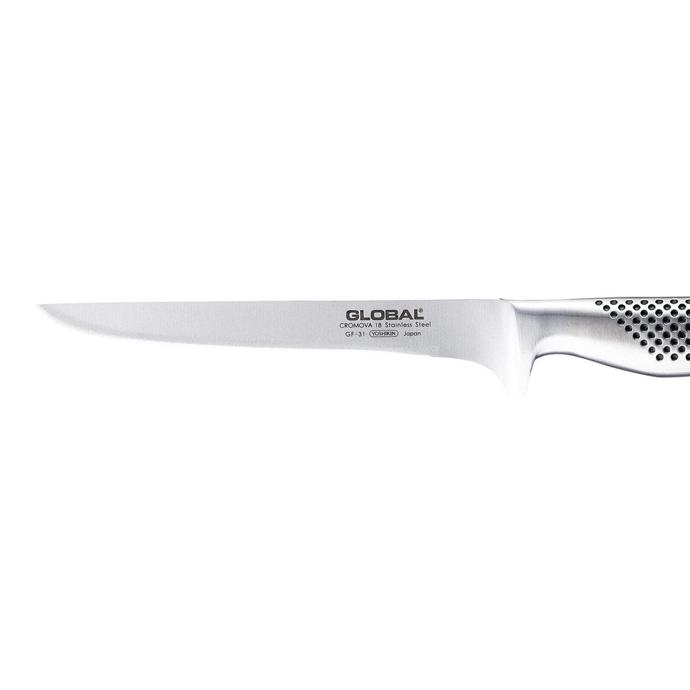 The GF-31 is a forged boning knife specifically made for removing bones from poultry, meat and fish. This knife features a sharp point and narrow stiff blade. The GF-31 includes a bolster which provides protection by preventing the hand from slipping forward onto the blade. This knife is perfect for regular use in professional kitchen settings, where repeated use of the boning knife is needed.