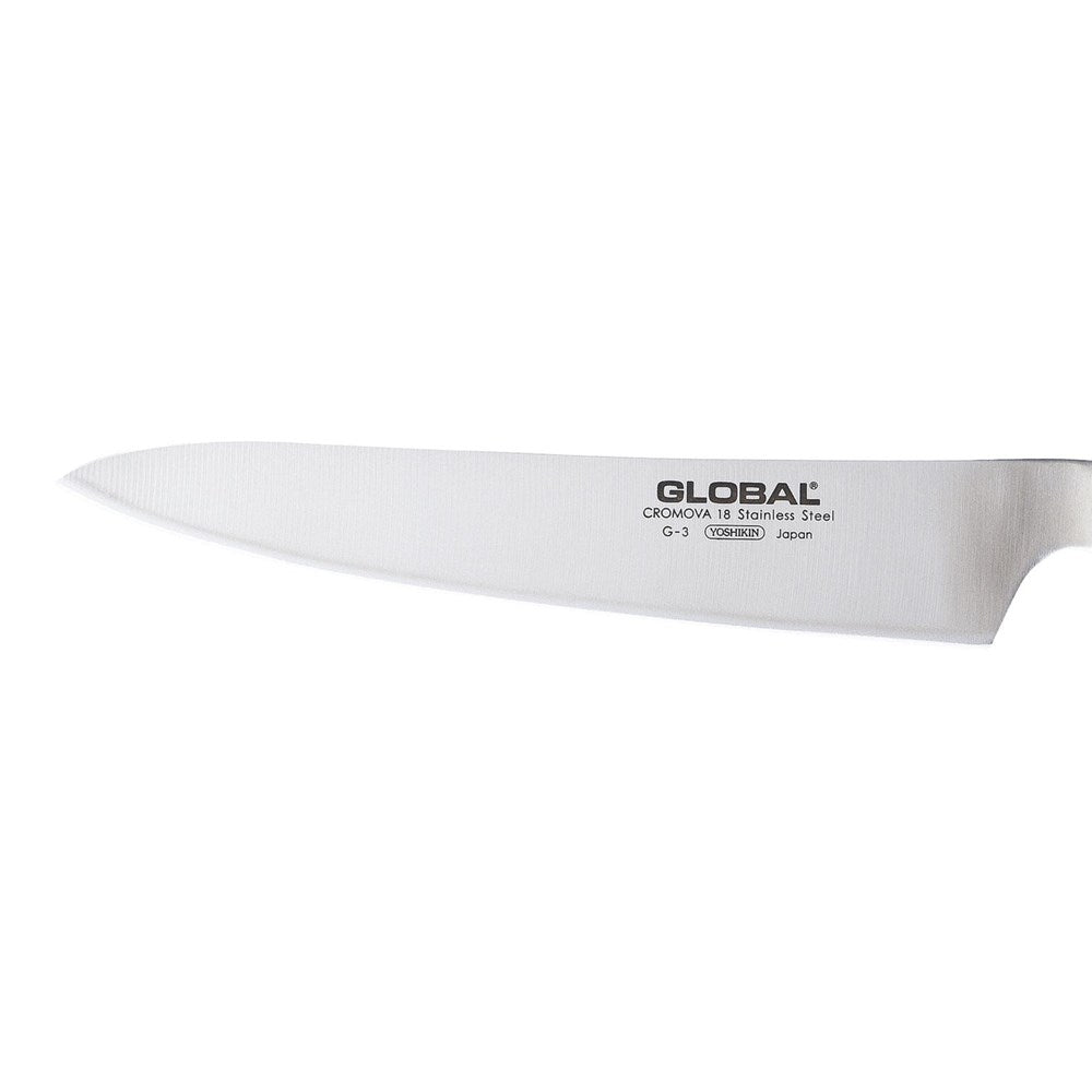 Global knives are made from Cromova 18 stainless steel, specially developed by Global as it holds a razor-sharp edge and resists rust, stains and corrosion. Ice tempered and hardened to Rockwell C56-58, each knife is carefully weighted by filling the handles with sand to achieve the optimum weight and perfect balance. Other unique features include its smooth contours and seamless construction which eliminates food and dirt traps offering the ultimate in safety and hygiene. The acute 15-degree angle cutting edge provides unsurpassed performance and superior edge retention.