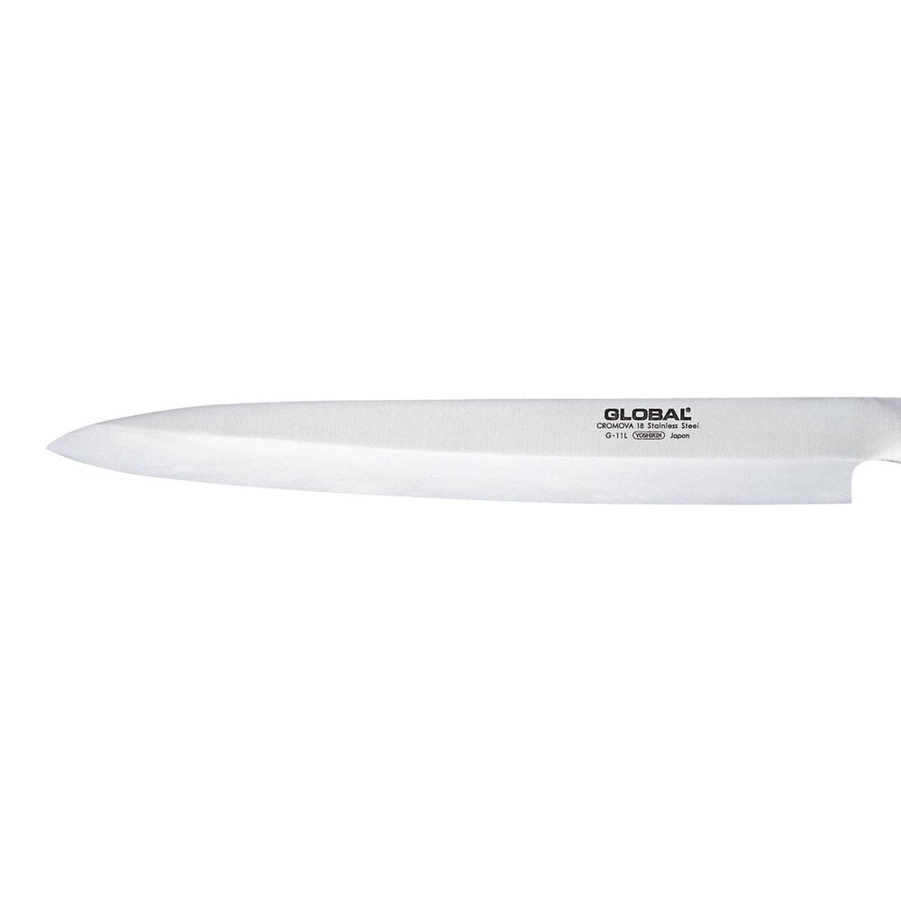 The G-11 25cm Yanagi is a specialist Japanese knife for preparing sushi and sashimi. The long single beveled blade allows the user to make clean, controlled cuts in a single stoke. The back face of the blade is concaved which creates non-stick properties and allows sliced pieces to be removed easily after cutting. This prevents tearing and bruising of the flesh.