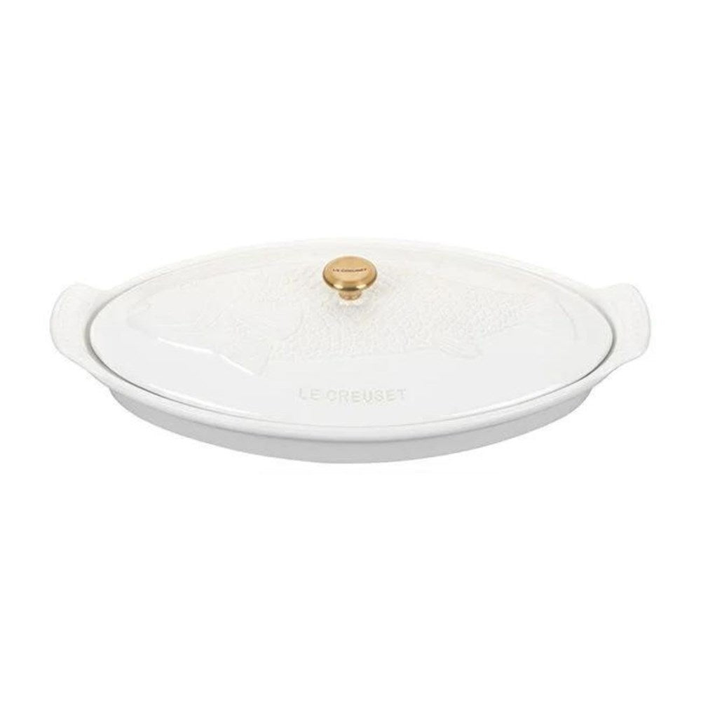 The 1.6L Fish Baker from Le Creuset features a covered oval baking dish embossed with an elegant fish motif and brushed gold knob. A striking presentation from oven to table, it’s perfect not only for baking, roasting, steaming, and broiling all manner of fish recipes – but also for roasting and steaming vegetables and meat, bubbling casseroles, one dish meals and more.