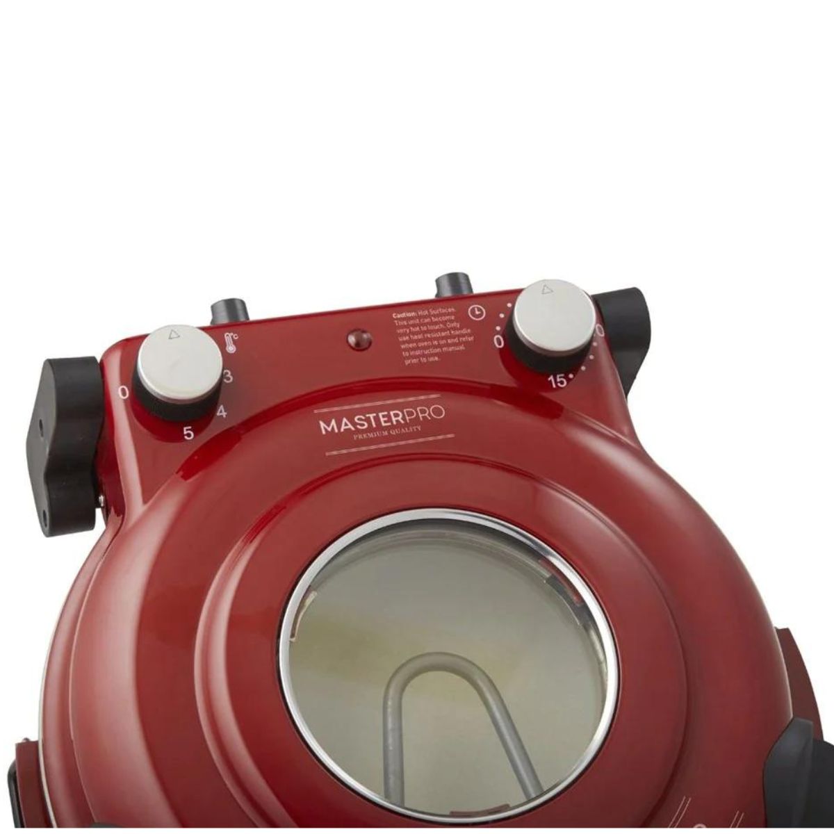 Cook perfectly crisp pizzas in just five minutes! This fantastic kitchen appliance comes in a beautiful red glaze and is designed with a special viewing window, allowing you to look inside and see when your pizza is cooked to perfection. Features dual cooking elements that heat up to 400C on the ceramic stone.