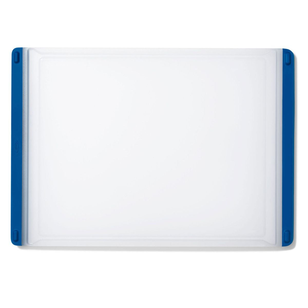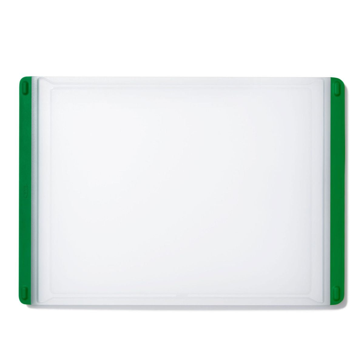 Kiss contamination worries goodbye when you use the OXO 3-Piece Everyday Cutting Board Set for meal prep. Non-porous construction keeps the cutting surface fresh, while color-coded bands keep you organized in the kitchen. Use red for meats, blue for fish, and green for veggies to so you always know which one to use for the task at hand. Soft, tapered edges double as handles for comfortable lifting and carrying, while the cutting surface goes easy on your knives. Non slip feet keep the cutting board in place for safety as you slice. Each board features an integrated drip-catcher to keep even the juiciest foods contained. When you're done, pour away excess liquid easily from any corner of the board and pop it in the dishwasher for thorough cleaning and sanitizing. These durable boards are dishwasher safe for everyone who loves cooking more than cleaning up afterward.