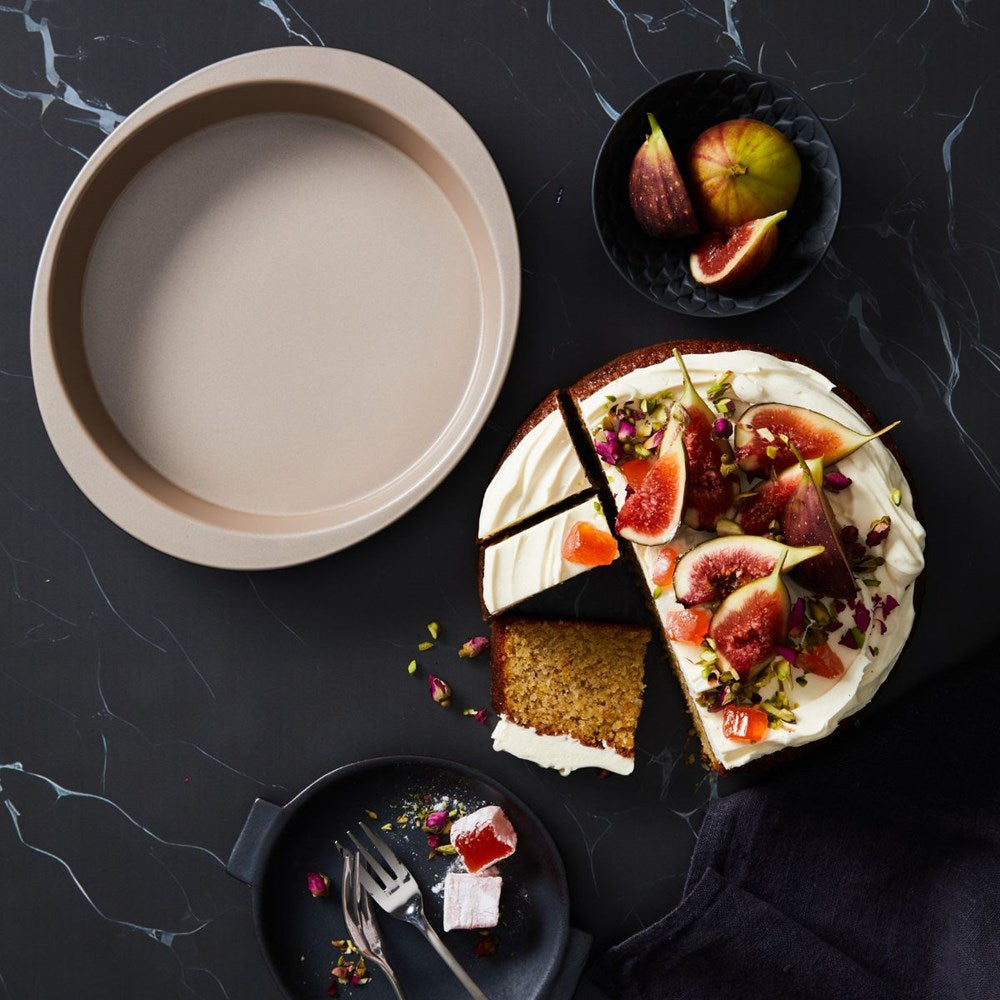 For Healthy Baking without Cadmium or Lead, the Ceramabake Round Cake Pan has a Ceramic Non Stick coating. The high performance, two layer nonstick delivers easy release and effortless clean up every time. The robust, heavy gauge carbon steel heats quickly and evenly for delicious results. Designed with a striking two tone finish, champagne gold and matte black.