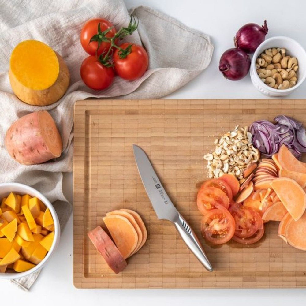 Nimble, light, and exceptionally comfortable, Zwillings made-in-Japan Twin Fin II knives are chip and corrosion resistant and easy to care for. With a FRIODUR ice-hardened blade made of Nitro 60 special formula stainless  steel, these knives boast long-lasting durability. The curved bolster acts as an extension of the hand and the ergonomic steel handle with gilled design is hygienic and exceptionally well balanced, promoting fatigue-free cutting even for the largest chopping tasks. These professional-style knives are also dishwasher safe, making quick work of clean up.